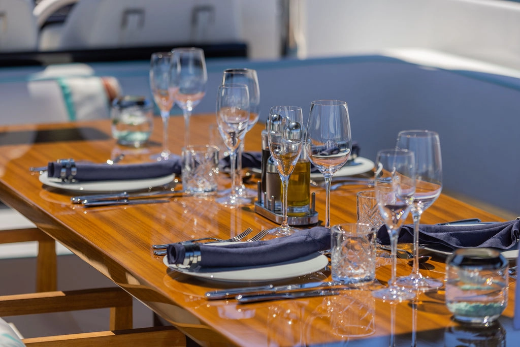 À l’extérieur, les vastes espaces de détente sont pensés pour sublimer chaque instant en mer : un cockpit arrière convivial pour des repas en plein air, un flybridge panoramique avec solarium pour admirer le coucher du soleil, et une plateforme de bain idéale pour plonger dans les eaux turquoise de la Méditerranée.